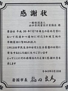 平成30年7月豪雨災害の災害復旧事業に関する感謝状の贈呈について(岩国市)